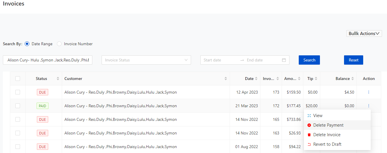 How to navigate: Invoices > Search Invoices (Select Customer) > Click on 3 vertical ellipses next to the invoice > Delete Payment