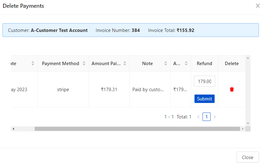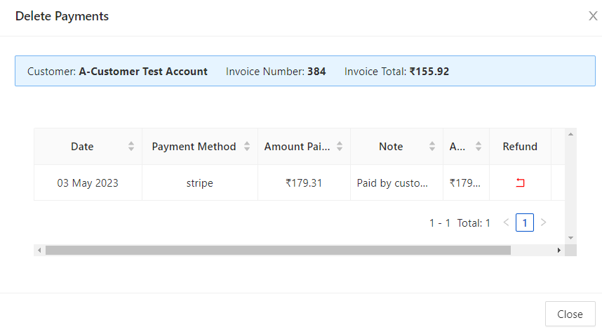 - Go to the invoice you want to refund. Then click on the 3 vertical ellipses on left of the invoice and select Delete Payment.